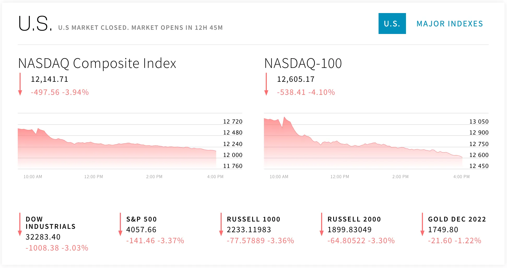 El rastreador de la actividad bursátil en el sitio web del Nasdaq, el mayor mercado de valores en línea, mostró flechas rojas que apuntaban a la baja en todo el tablero doce horas antes de que el mercado de valores estadounidense abriera el lunes.