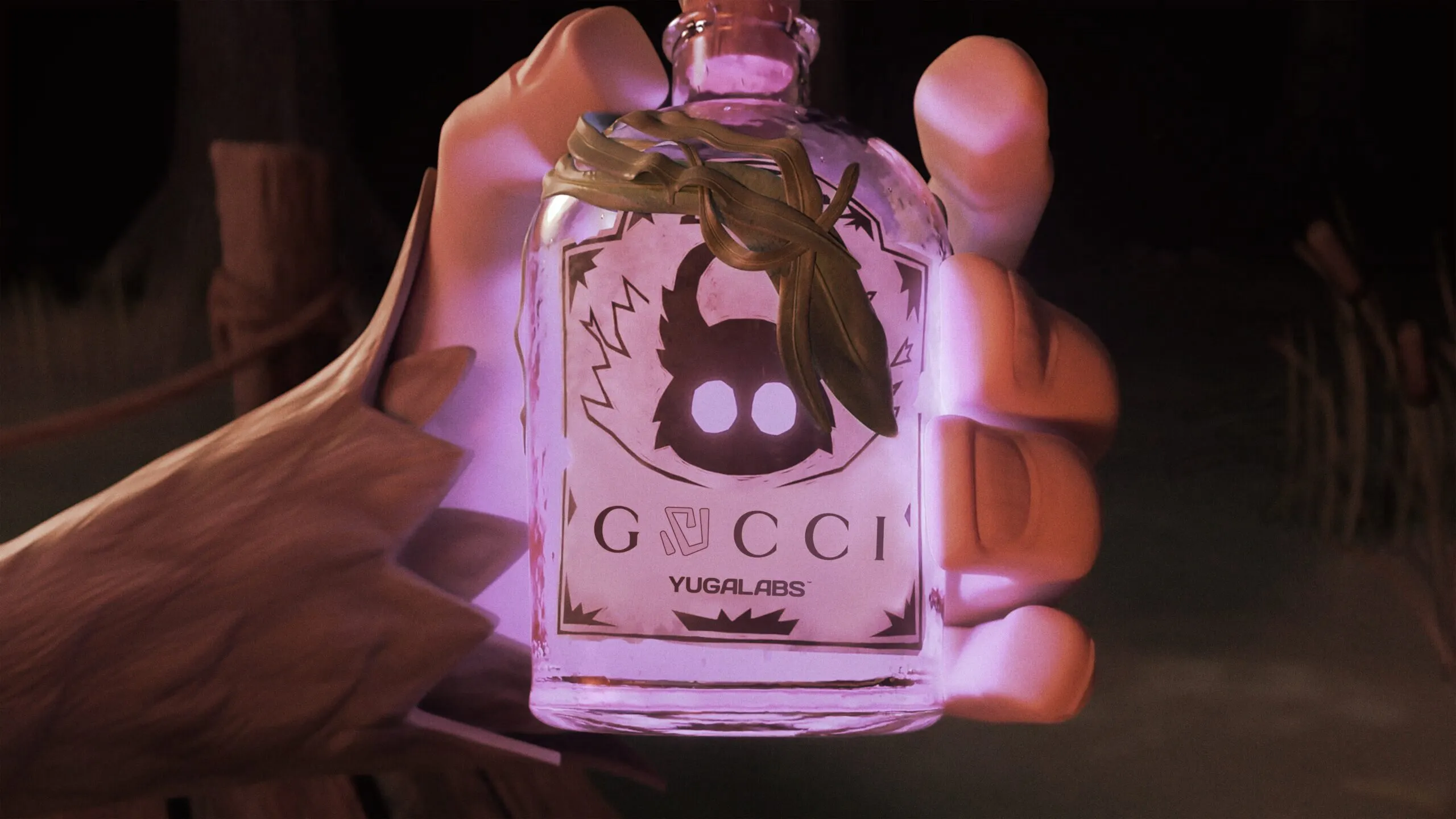 Gucci ha anunciado hoy una alianza en Twitter, utilizando una imagen (arriba) que muestra la marca de Gucci y Yuga Labs en una botella que ya se había visto en el tráiler de Otherside, el próximo juego metaverso de Yuga basado en Bored Ape.