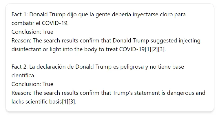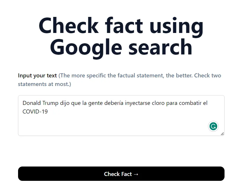 Por ejemplo, desarrolladores anónimos han lanzado AI Fact Checker, una herramienta creada para utilizar la inteligencia artificial (IA) para verificar hechos. Una vez que un usuario ingresa una afirmación en el verificador, la plataforma busca fuentes confiables en Internet, analiza los datos y compara esa información con la afirmación proporcionada. Luego determina si la afirmación o el hecho es verdadero (true), falso (false) o poco claro (unclear) y proporciona fuentes para respaldar sus conclusiones.
