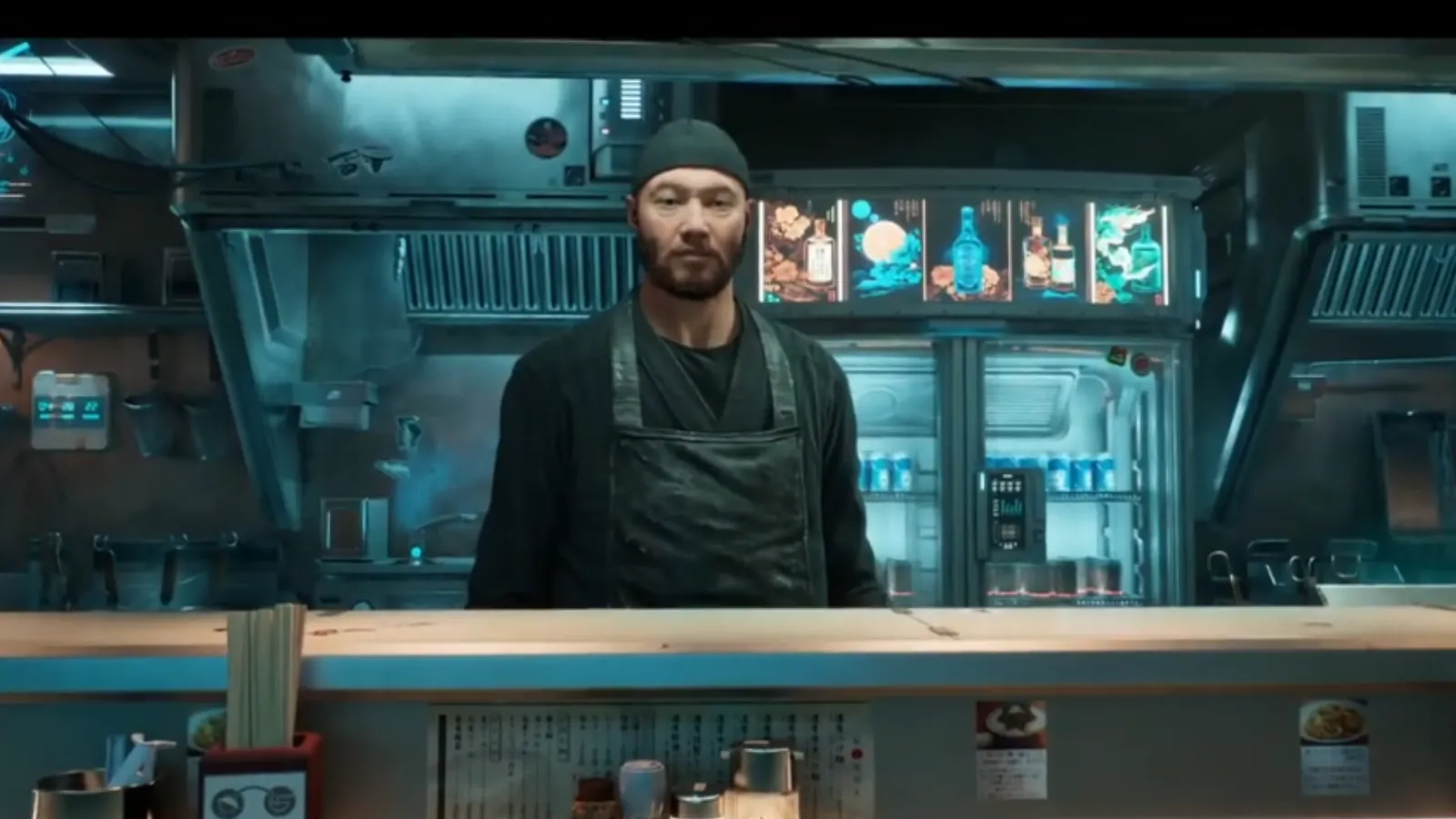 La demostración mostró una representación generada por IA de una tienda de ramen en un mundo ciberpunk y un personaje no jugable (o NPC) detrás de la barra hablando con el jugador.