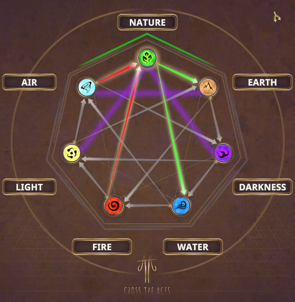 El heptagrama muestra cómo los elementos del juego se afectan entre sí. Imagen: Cross the Ages