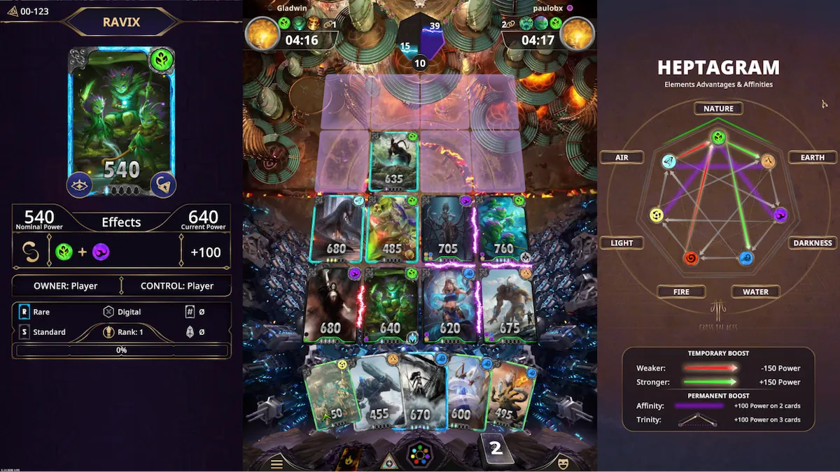 Si controlas tres cartas cuyos elementos están uno al lado del otro en el heptagrama, crearás una trinidad. Esto aumenta el poder de tus cartas, así como te da puntos. Un ejemplo de una trinidad en acción es la combinación de aire, naturaleza y tierra. El juego se vuelve más profundo que esto con cartas que aumentan los elementos, habilidades y más, pero en interés del tiempo (y la cordura), te dejaré con lo básico.