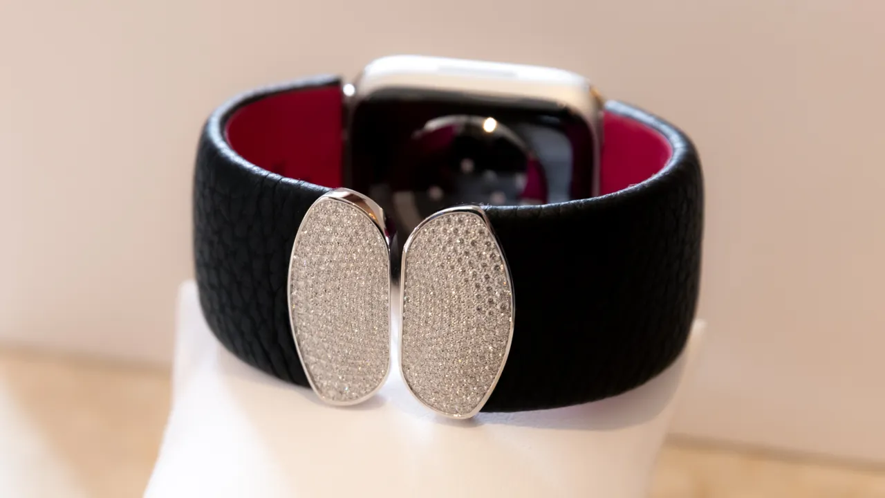 Esa interpretación cuenta con más de 400 diamantes VVS que suman un total de 2.5 quilates, engastados en paladio de oro blanco y requieren unas 136 horas de trabajo manual. Los puños están diseñados para que el reloj inteligente de Apple se pueda llevar debajo de la muñeca, para que tus mensajes no aparezcan inesperadamente y que todos los vean.