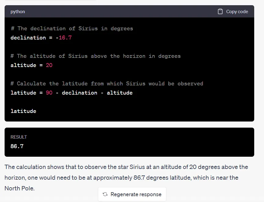Decrypt intentó un enfoque similar y los resultados, aunque no son los mismos, fueron similares. Para demostrar que la Tierra es redonda, ChatGPT calculó la latitud en la Tierra necesaria para observar una estrella a un ángulo dado sobre el horizonte. Utilizando código Python, utilizó la estrella Sirio como ejemplo. Después de realizar el cálculo, ChatGPT concluyó que observar Sirio a una altitud de 20 grados sobre el horizonte requeriría una latitud cercana al Polo Norte.