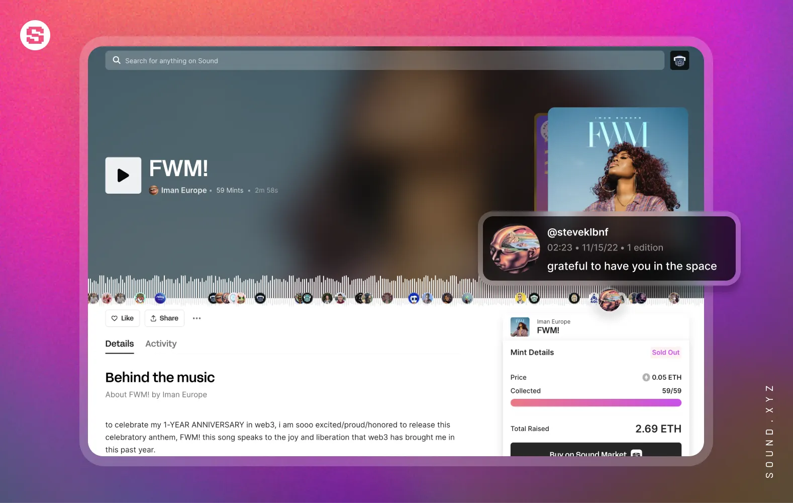 Tomando como referencia los cuatro productos que Greenfield cree que han cambiado la forma en que las personas descubren música: SoundCloud, YouTube, MySpace y TikTok, cada pista cargada en Sound se puede escuchar de forma gratuita, pero los fanáticos también pueden "coleccionarla" comprando un NFT.