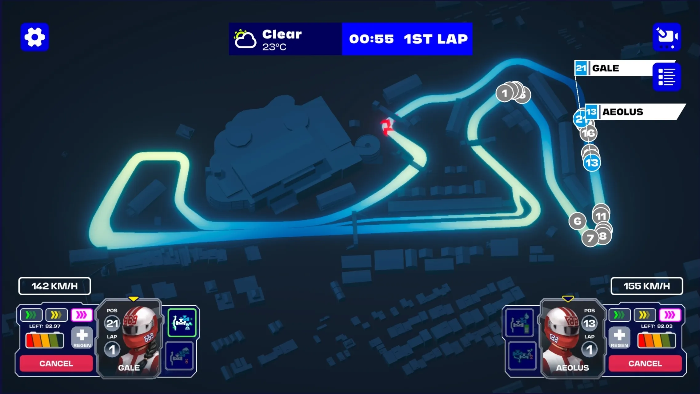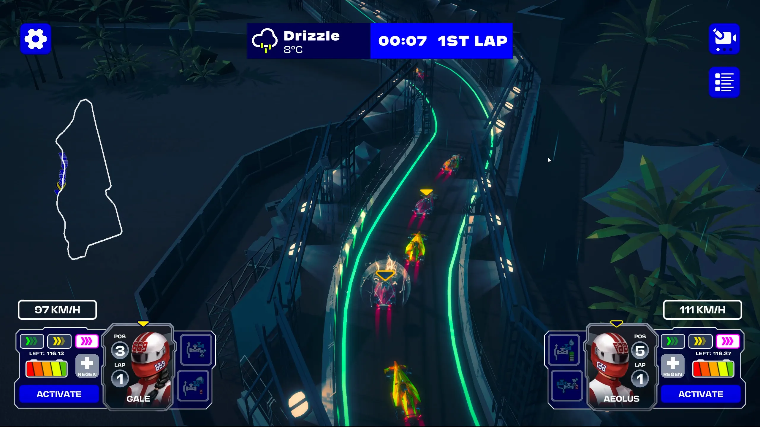 Una vez que la carrera haya comenzado, tienes tres formas de influir en tus pilotos. Debes usar estas herramientas para adelantar a tus oponentes mientras administras la batería de tu auto; si te quedas sin batería, te ralentizarás significativamente.