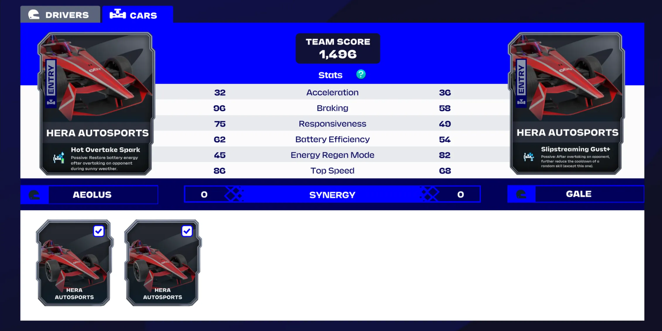 Cuando juegas por primera vez, se te asignan dos pilotos y autos al azar. Cada piloto y auto tendrá estadísticas únicas para consideraciones como el manejo en las curvas, la gestión de energía y la velocidad máxima. Cada estadística se suma para crear la puntuación de tu equipo.