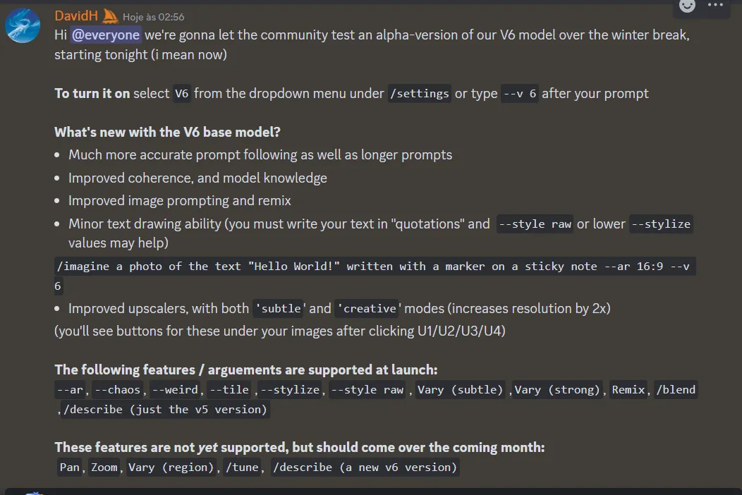 La nueva versión ofrecerá "más seguimiento preciso de las indicaciones, así como indicaciones más largas, mejor coherencia y conocimiento del modelo", revela el anuncio, destacando su avance respecto al modelo V5.1 lanzado en mayo de 2023. El modelo V5, conocido por sus indicaciones cortas fáciles de usar y su mejora estética, allanó el camino para el V6 más sofisticado y detallado.