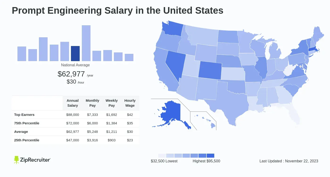 El atractivo financiero de los trabajos de IA es innegable. Específicamente para los ingenieros de prompt, los datos de un informe de ZipRecruiter muestran un salario promedio de $62.977 al año en los EE. UU., con los mejores empleos llegando hasta $95.500 al año. La ciudad que mejor paga salarios por ingeniería de prompt de hasta $80.745, es Berkeley, California.