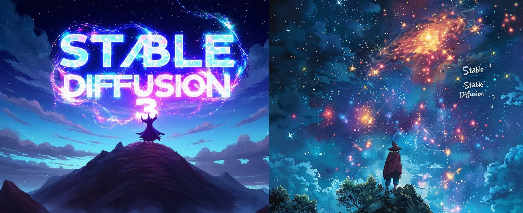 Prompt: “Épica obra de arte de anime de un mago en la cima de una montaña por la noche lanzando un hechizo cósmico al cielo oscuro que dice ‘Stable Diffusion 3’ hecho de energía colorida.”