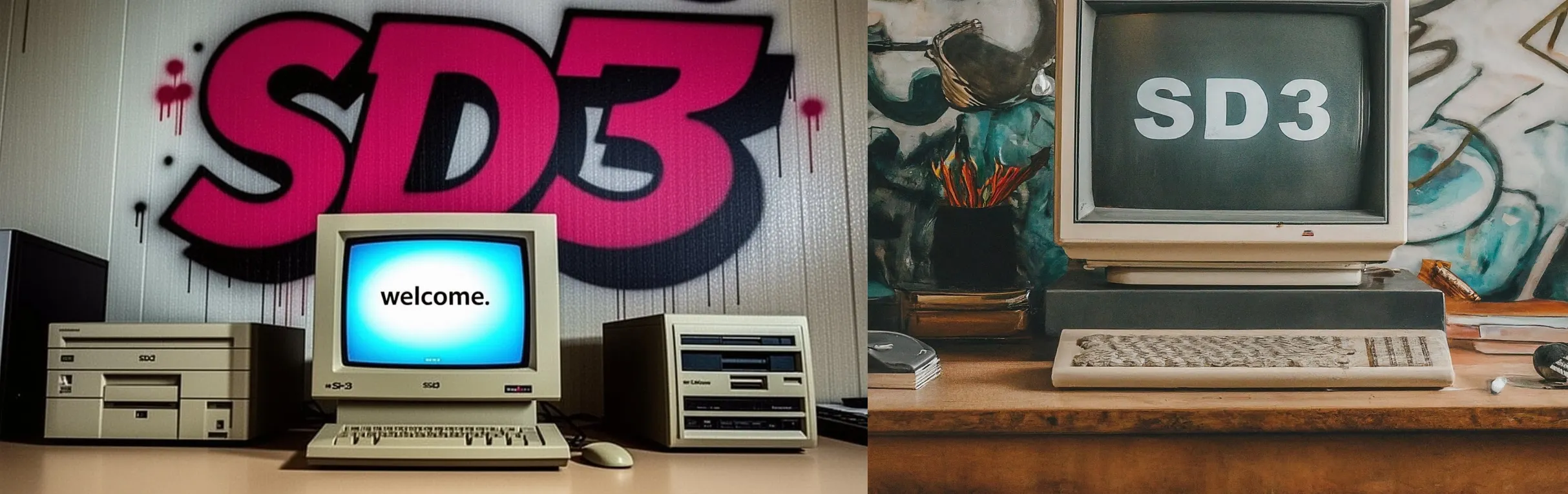 Prompt: “Foto de un ordenador de escritorio de los años 90 en un escritorio de trabajo. En la pantalla del ordenador dice ‘bienvenido’. En la pared de fondo vemos un hermoso graffiti con el texto ‘SD3’ muy grande en la pared.”