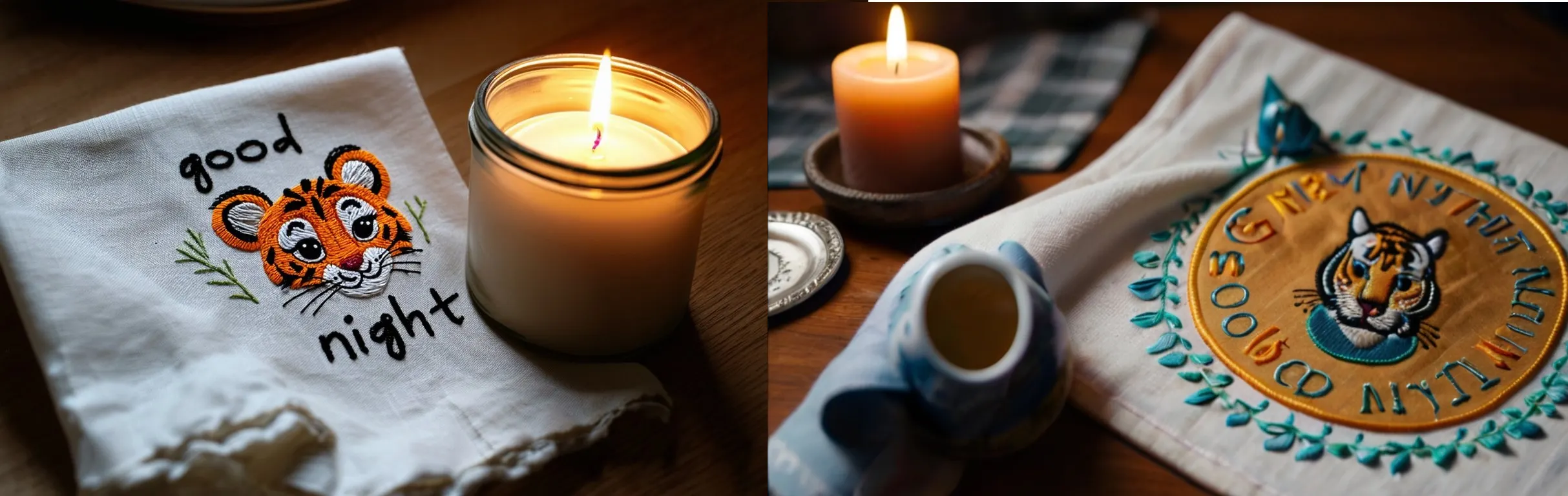 Prompt: “Descansando sobre la mesa de la cocina hay un paño bordado con el texto ‘buenas noches’ y un bebé tigre bordado. Junto al paño hay una vela encendida. La iluminación es tenue y dramática.”
