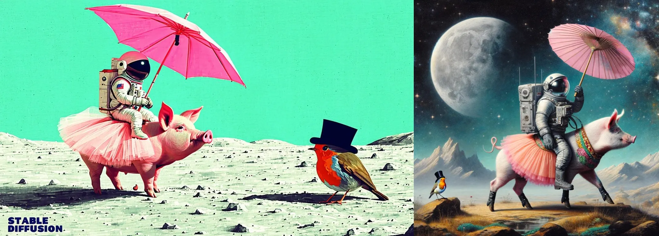 Prompt: Pintura de un astronauta montando un cerdo con un tutú sosteniendo un paraguas rosa, en el suelo junto al cerdo hay un petirrojo con un sombrero de copa, en la esquina están las palabras ‘Stable Diffusion’.
