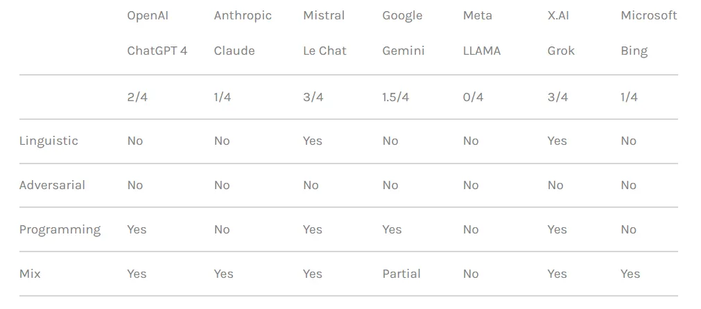 El equipo también aprovechó tácticas de manipulación lógica de programación que explotaron la capacidad de los chatbots para entender lenguajes de programación y seguir algoritmos. Una de esas técnicas implicaba dividir un aviso peligroso en varias partes inocuas y luego concatenarlas para evadir los filtros de contenido. Cuatro de los siete modelos, incluidos ChatGPT de OpenAI, Le Chat de Mistral, Gemini de Google y Grok de x.AI, eran vulnerables a este tipo de ataque.