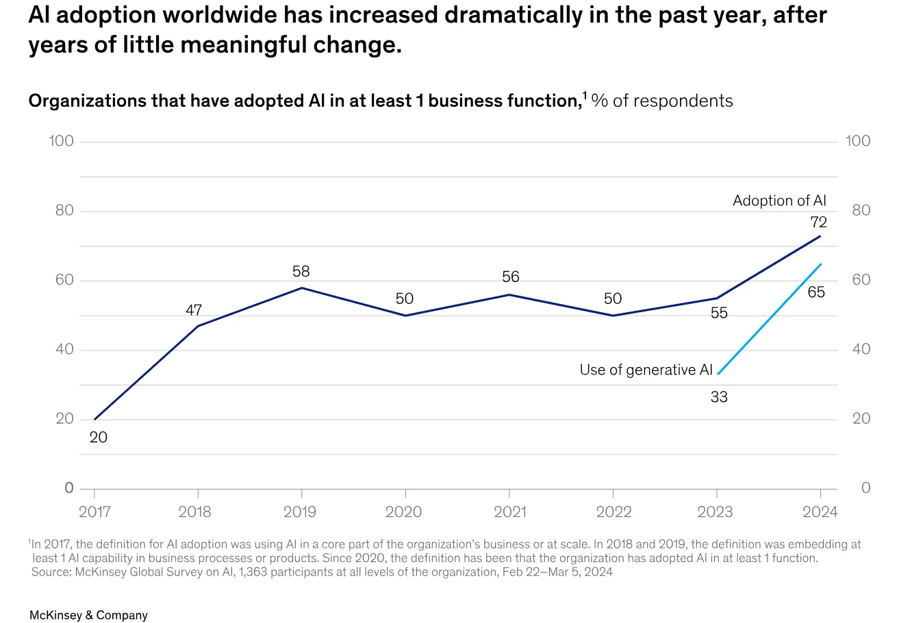 En una encuesta realizada a más de 1.363 encuestados, el 72% dijo que sus organizaciones habían adoptado alguna forma de IA en al menos una función empresarial, y el 65% dijo que sus organizaciones estaban utilizando regularmente IA generativa, esto representa el doble de la tasa del 33% reportada en 2023.