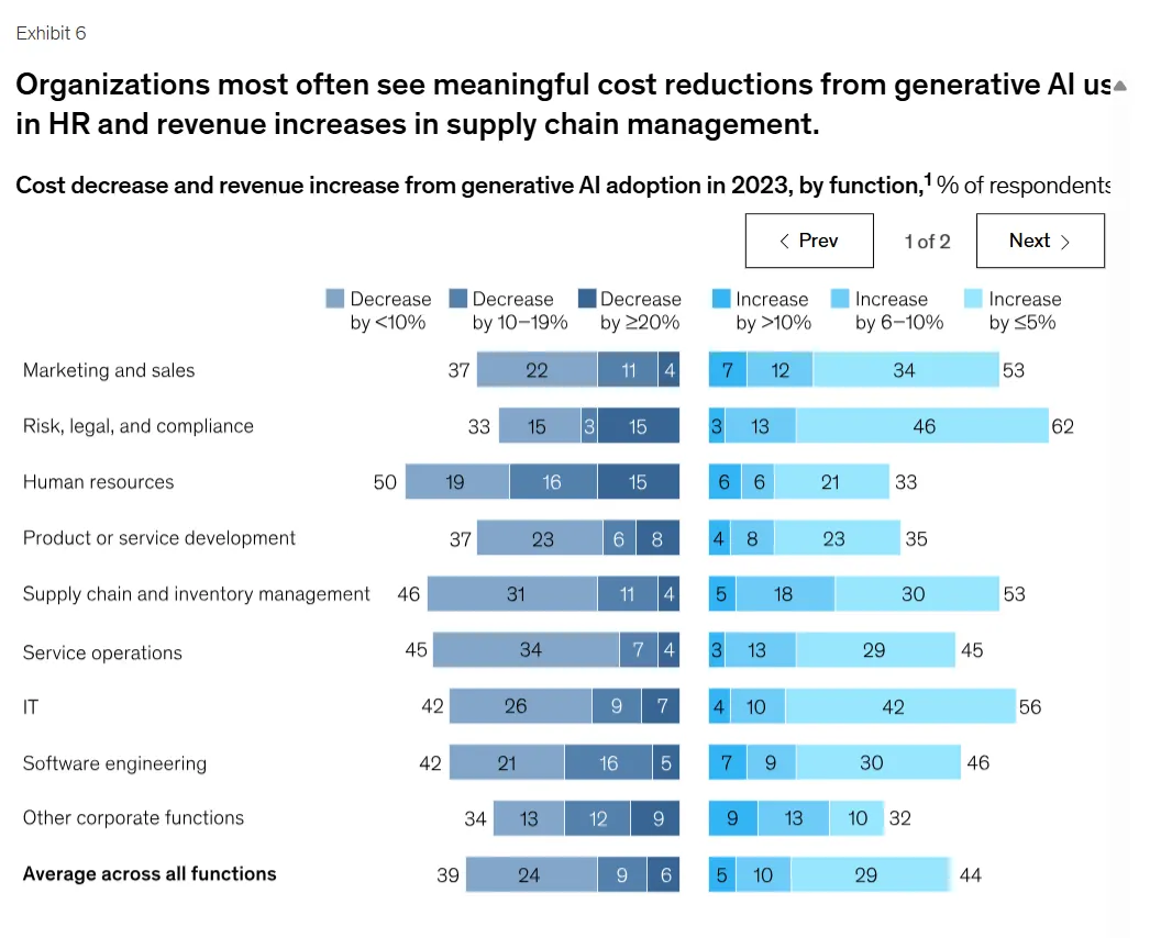 “La organización promedio que utiliza la IA generativa lo hace en dos funciones, más a menudo en marketing y ventas y en el desarrollo de productos y servicios”, dice el estudio. Solo en ventas, el uso de la IA generativa se ha más que duplicado desde el año pasado.