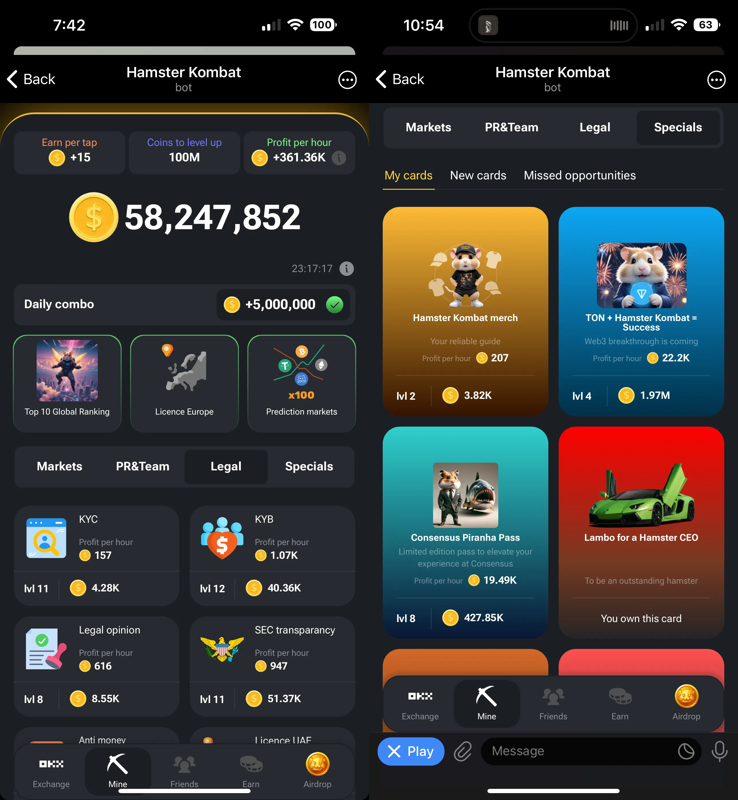 Al invertir en varios mercados, relaciones públicas, equipo y mejoras legales, junto con cartas especiales, acumularás monedas gradualmente sin hacer absolutamente nada, incluso cuando no estás jugando. ¡Tienes que gastar dinero para ganar dinero!, ¿cierto? Bueno, esta es la versión de Hamster Kombat de ese dicho.