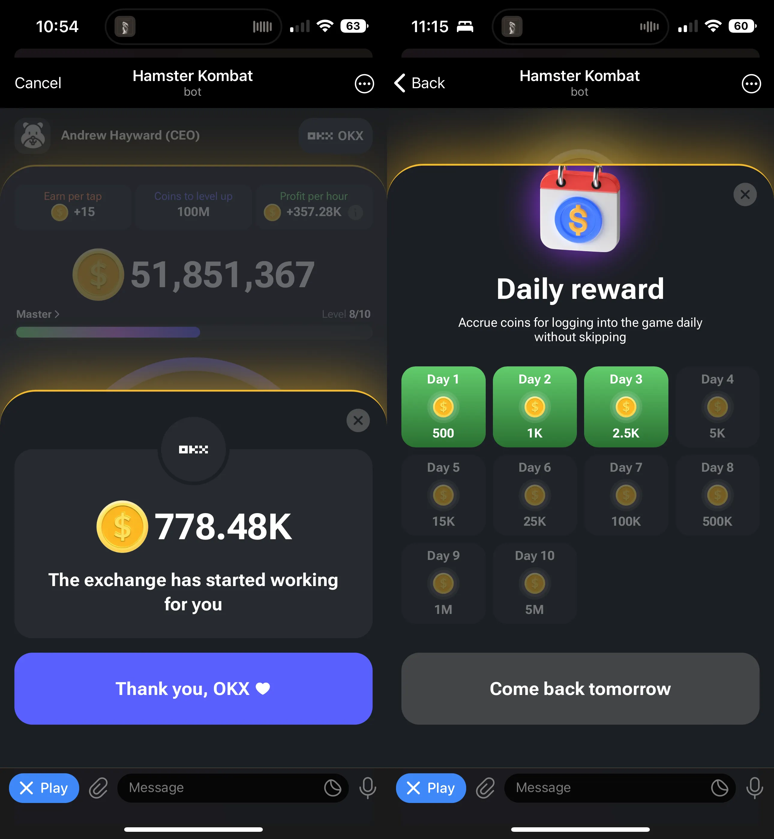 Por supuesto, necesitarás jugar regularmente para maximizar tus ingresos pasivos. Hamster Kombat solo seguirá acumulando monedas gratuitas mientras estés desconectado durante un total de tres horas. Después de eso, las monedas dejarán de llegar hasta que abras el juego, reclames tus ganancias acumuladas y reinicies el contador. Afortunadamente, solo toma unos segundos y luego puedes volver a salir.