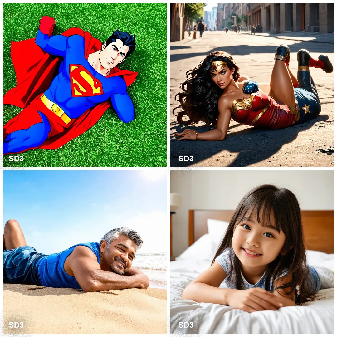 Esta imagen fue seleccionada porque una de las primeras cosas que la comunidad de arte de IA notó fue la incapacidad de SD3 para generar imágenes de personas acostadas en el césped. De hecho, esto se ha convertido rápidamente en un meme.