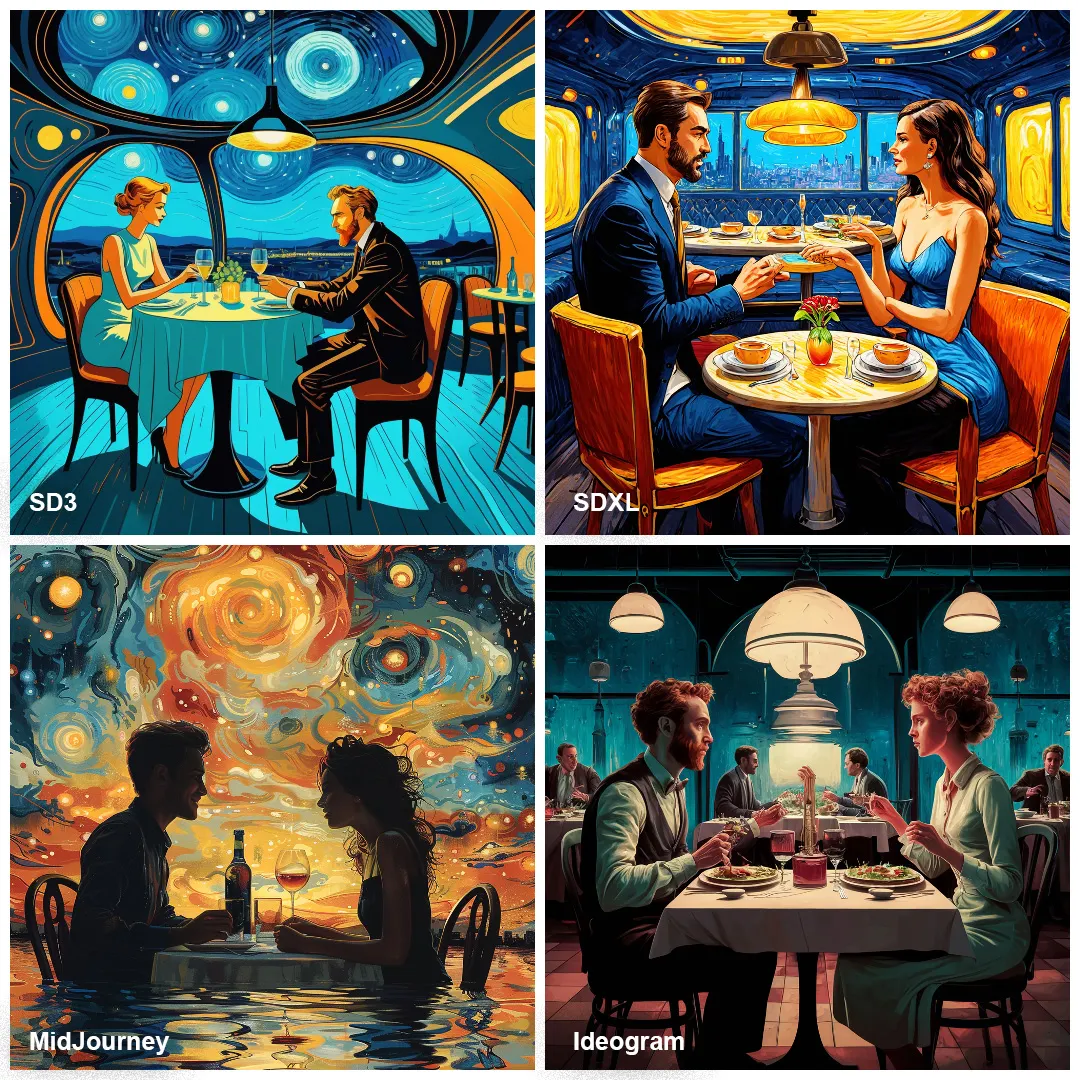 SD3 demostró una fuerte capacidad para replicar el estilo de Van Gogh, incorporando sus pinceladas distintivas y paleta de colores a lo largo de la obra, y notablemente con la representación de la pareja. La composición también representó con precisión un restaurante futurista. SDXL siguió de cerca, fusionando personajes de estilo cómico realista con un entorno inspirado en Van Gogh.