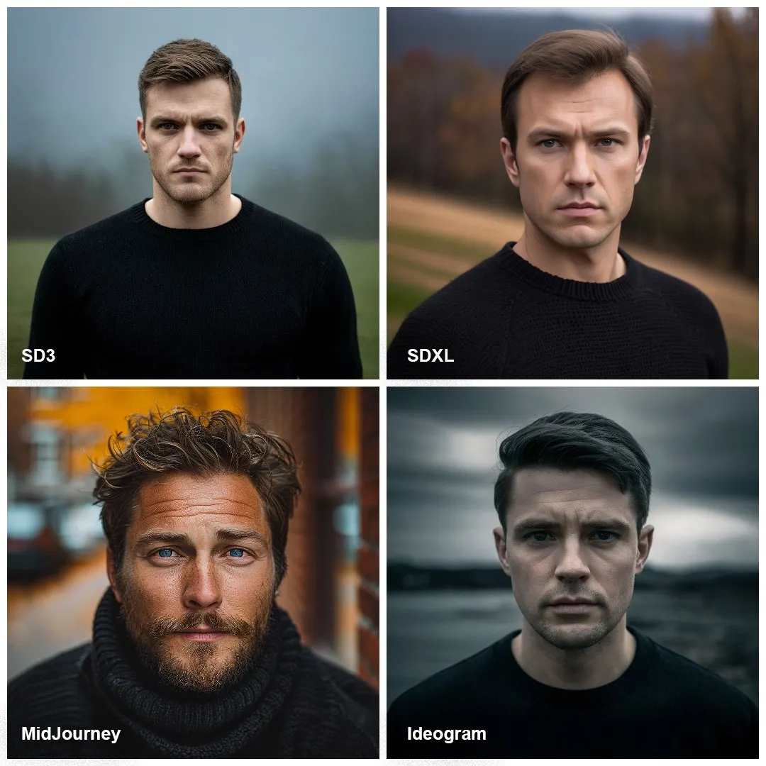 La composición de Ideogram cumplió con todos los criterios, ofreciendo un encuadre de primer plano, un suéter negro, una expresión seria, iluminación exterior sombría y un toque de desenfoque en el fondo. También fue la foto más realista entre los modelos.