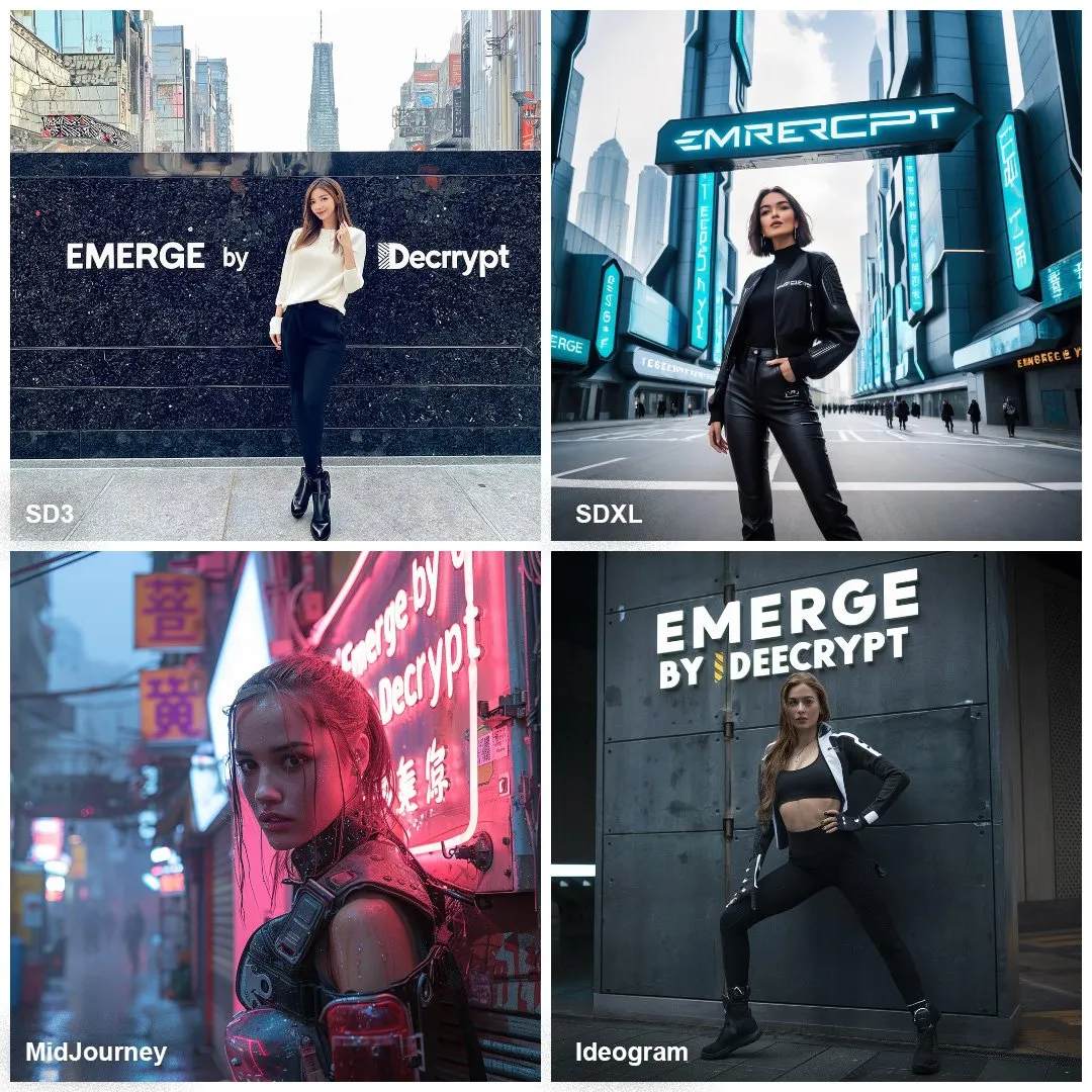 La generación de texto resultó desafiante para todos los modelos. Ninguno de los modelos logró representar con precisión el texto "Emerge by Decrypt". SDXL proporcionó el paisaje urbano más futurista, pero no incluyó todos los elementos especificados en el prompt. SD3 logró generar la pared, el letrero y la ciudad, aunque con inexactitudes en el texto.
