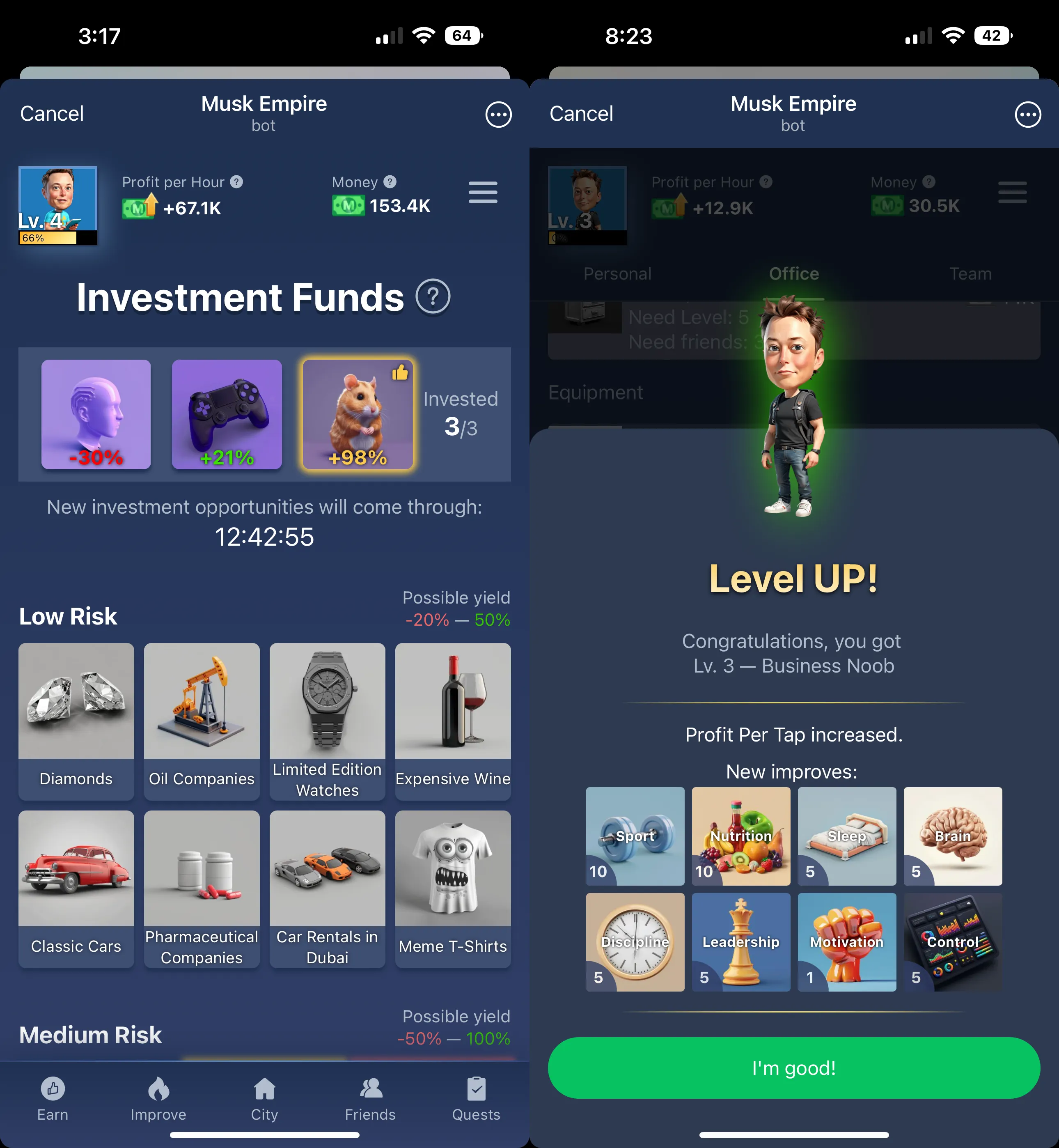 - Aunque tiene similitudes con Hamster Kombat, Musk Empire añade características únicas como una "Bolsa de Valores" para hacer staking con monedas y enfrentamientos en "Negociaciones" con amigos.