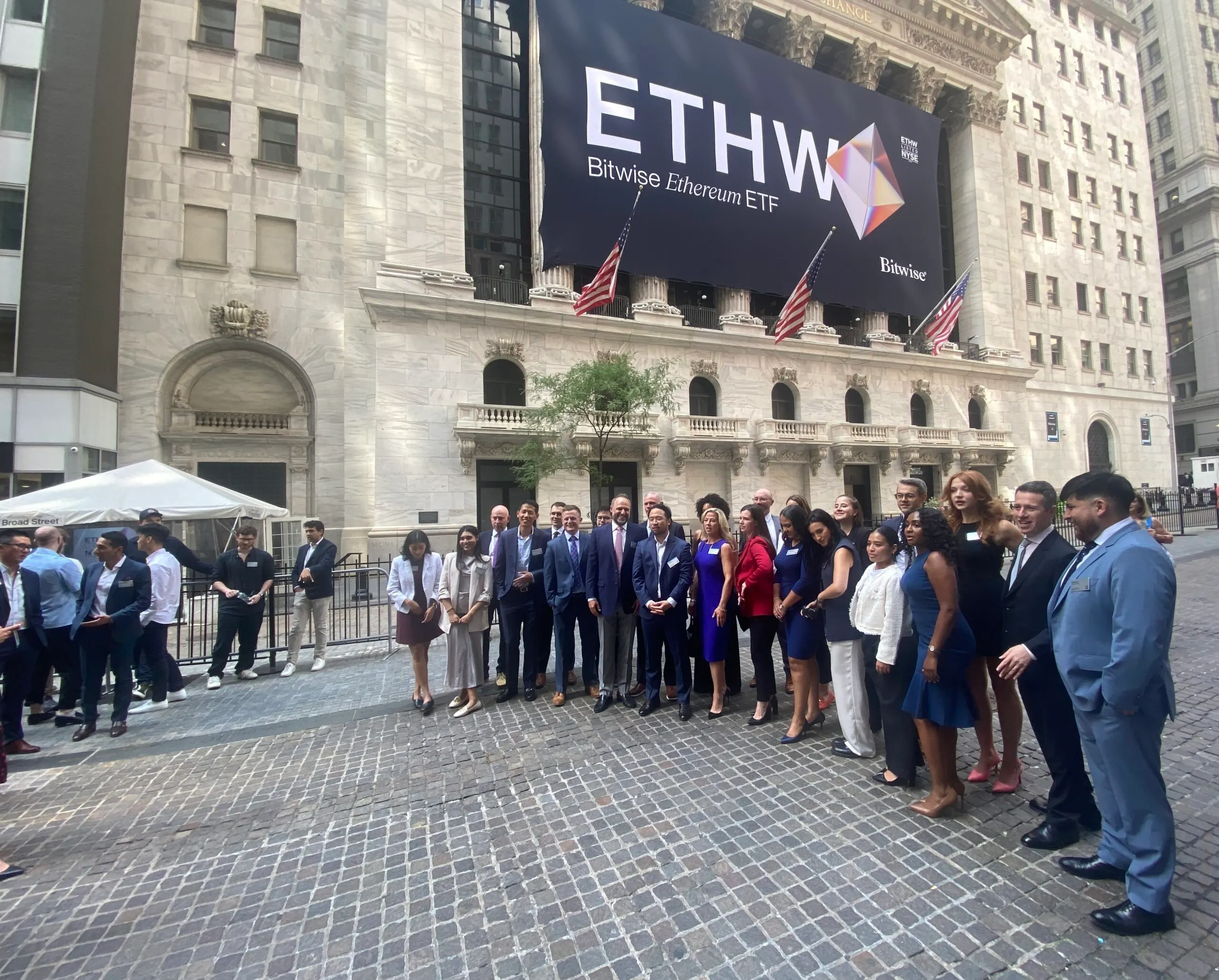 Sobre la fachada de 121 años de la Bolsa de Nueva York, colgaba como una bandera pirata recién izada una pancarta impresa de un ETF de Ethereum. Los turistas se detuvieron, miraron y señalaron. Los más jóvenes explicaron qué era Ethereum a sus familias y especularon sobre la parte del ETF.