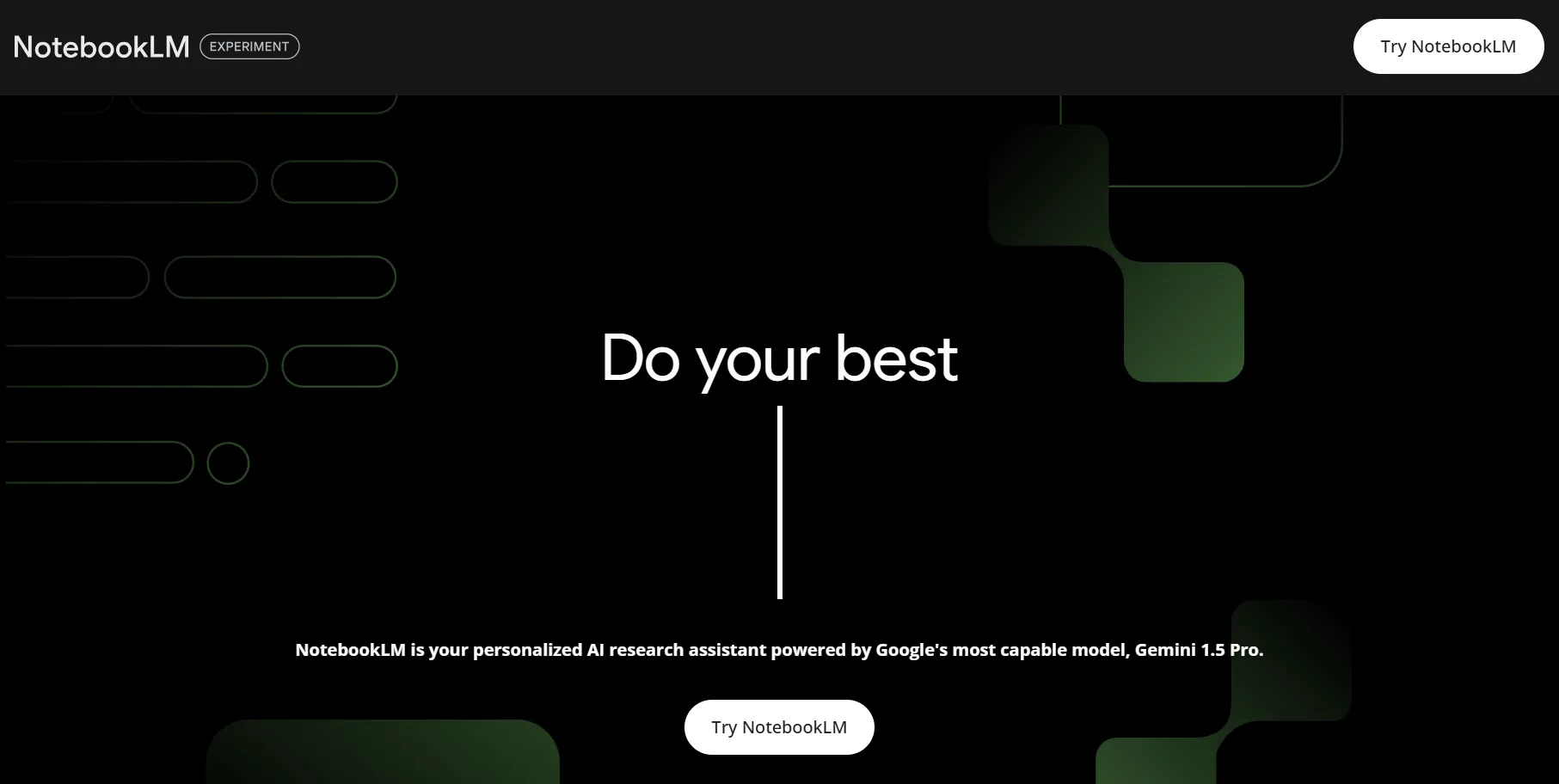 Simplemente, ve al sitio oficial de NotebookLM y haz clic en el botón “Try NotebookLM” en la esquina superior derecha.