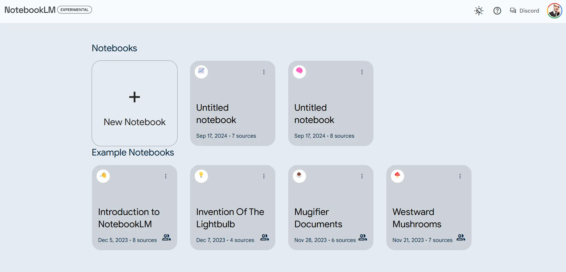 Una vez dentro, puedes jugar con algunos ejemplos pre-cargados, interactuar con ellos, escuchar esos podcasts y familiarizarte con la herramienta, o puedes generar tus propios podcasts. Para hacerlo, haz clic en la pestaña que dice “New Notebook”