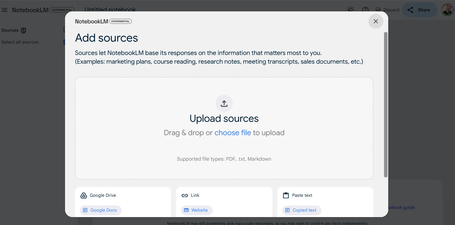 Puedes trabajar desde la ventana emergente o agregar fuentes manualmente cerrando la ventana emergente y haciendo clic en el botón de suma en el panel izquierdo. Si hay una fuente específica que no deseas que el modelo excluya, puedes desmarcarla.