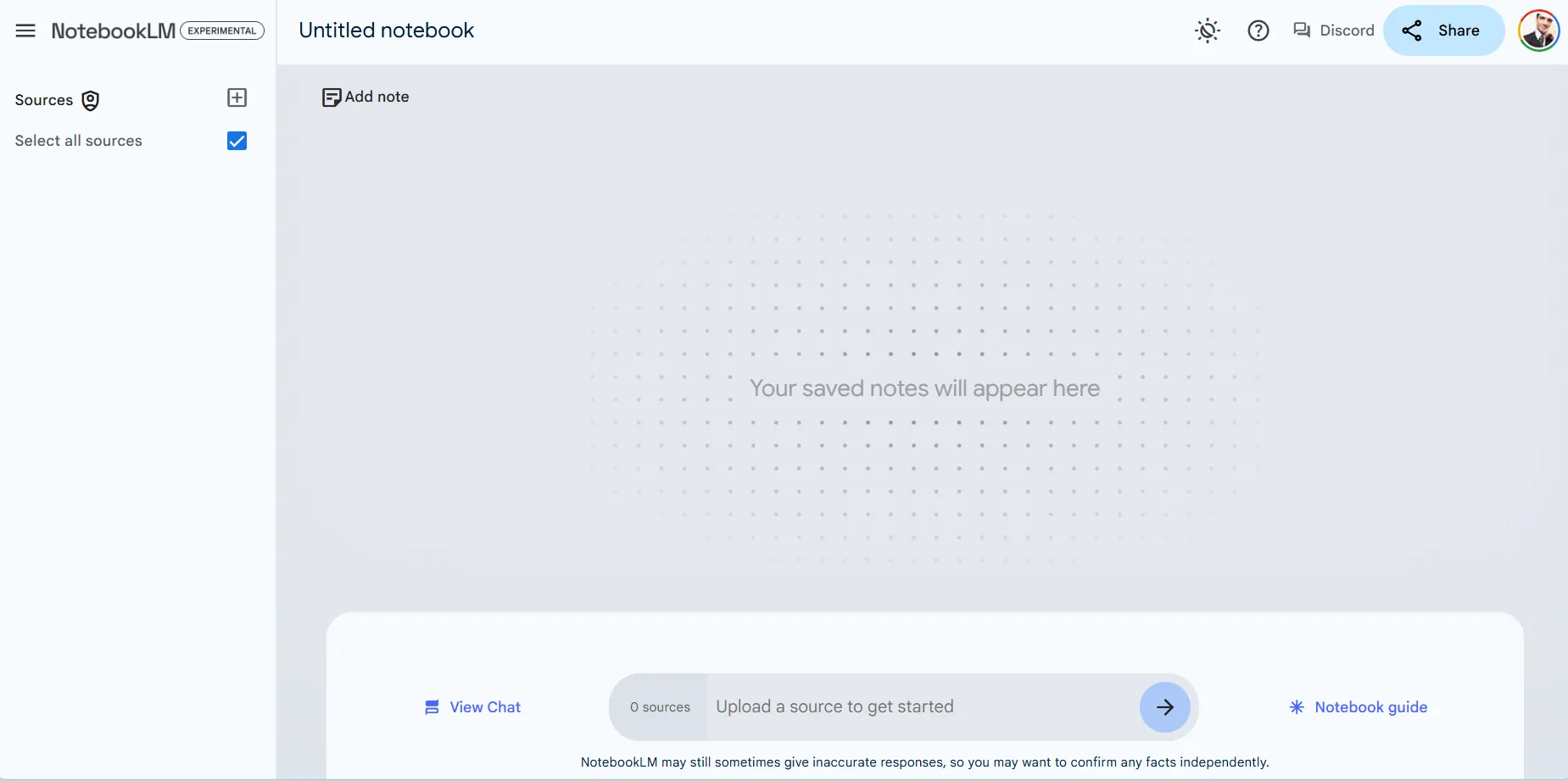 Una vez dentro, encontrarás una interfaz de usuario bastante intuitiva. Lo primero que debes hacer es agregar las fuentes que NotebookLM analizará para interactuar contigo a través del chat o generar el podcast. Si optas por la opción de chat, la IA será completamente de texto, ayudándote a comprender tu información y presentarla mejor. No afectará el formato del podcast.