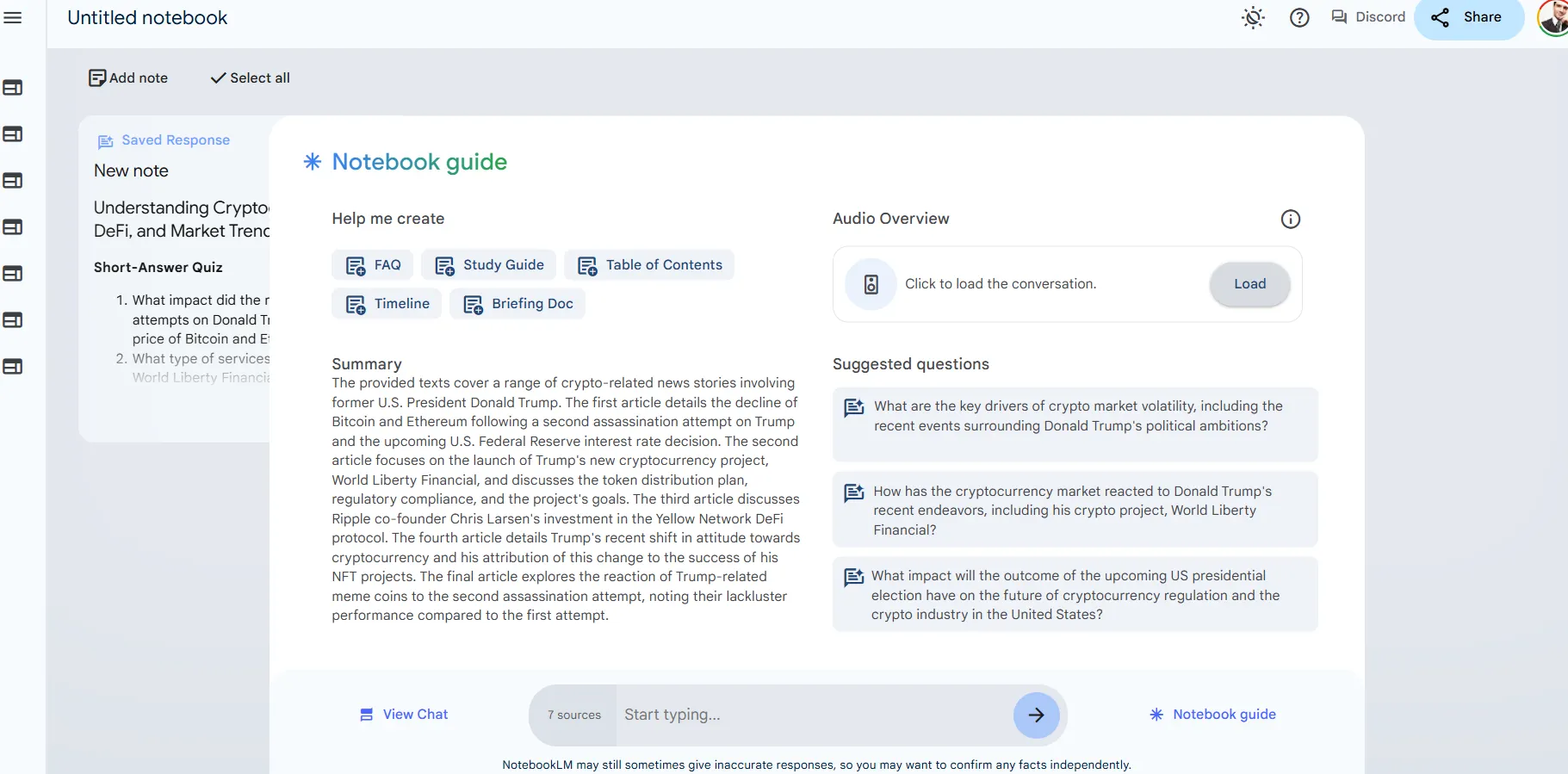 Probamos NotebookLM con un caso práctico del mundo real. Utilizando diversas fuentes de la amplia cobertura de la entrevista de Donald Trump el lunes con Rug Radio—la empresa hermana de Decrypt—ingresamos la información en el sistema. Y los resultados fueron bastante buenos.