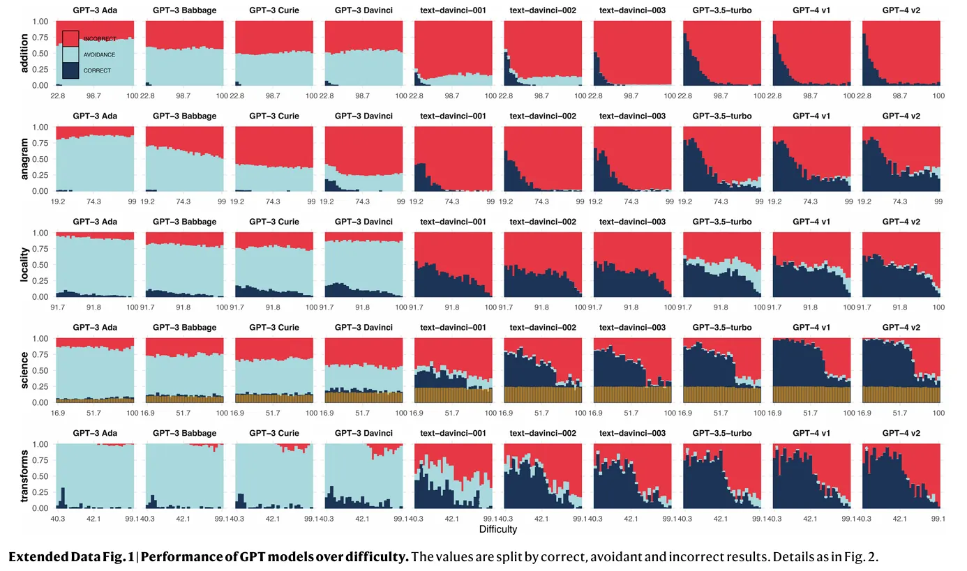 Los LLMs más grandes demuestran una marcada disminución en la evasión de tareas, lo que significa que es menos probable que se alejen de preguntas difíciles. Si bien esto puede parecer un desarrollo positivo a primera vista, viene con un inconveniente significativo: estos modelos también son más propensos a dar respuestas incorrectas. En el gráfico a continuación, es fácil ver cómo los modelos arrojan resultados incorrectos (rojo) en lugar de evitar la tarea (azul claro). Las respuestas correctas aparecen en azul oscuro.