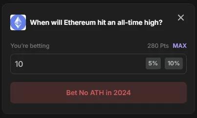Independientemente de cómo estés viendo un mercado de predicción, participar es simple: simplemente haz clic en el botón debajo del mercado correspondiente al resultado que crees que es más probable que ocurra, y escribe la cantidad de puntos que deseas apostar. Hay botones para apostar el 5%, 10% o 100% de tus puntos disponibles. Una vez que hayas seleccionado cuántos puntos deseas apostar, haz clic en el botón debajo del mercado para apostarlos.