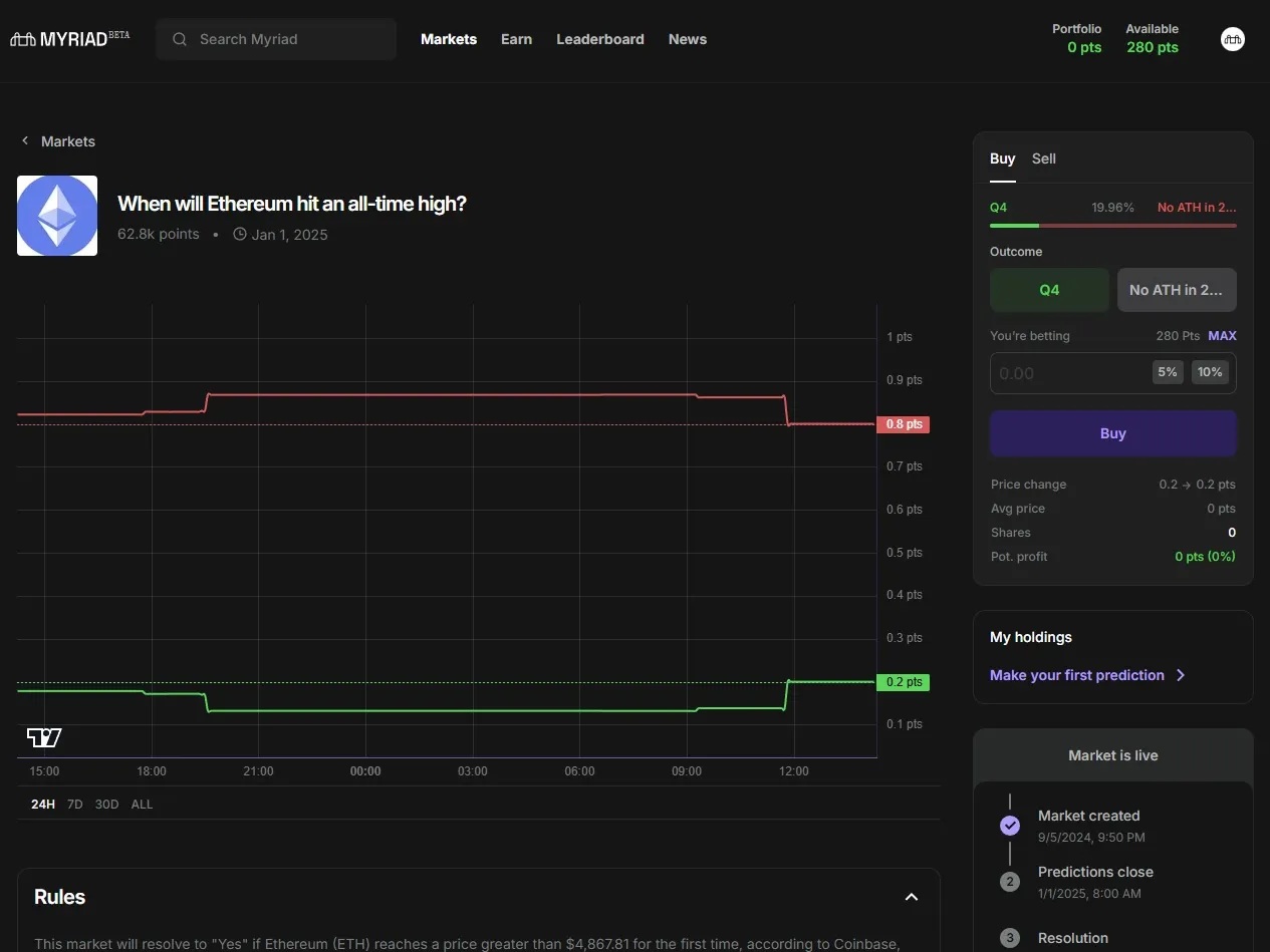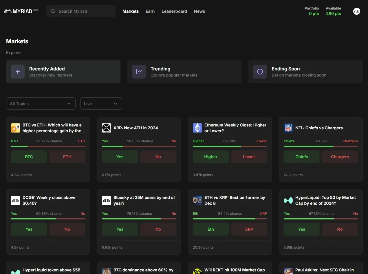 Los mercados de predicción on-chain de MYRIAD son el corazón de la plataforma, permitiendo a los usuarios respaldar sus predicciones sobre eventos del mundo real con Puntos. Esos eventos pueden incluir desde deportes y criptomonedas hasta juegos y política.