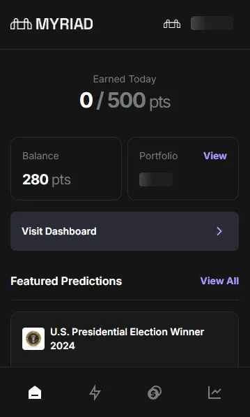 Los puntos son tu pase para acceder a todo en MYRIAD. Puedes apostar en mercados de predicción, participar en concursos de la comunidad y subir en las clasificaciones contra otros jugadores.