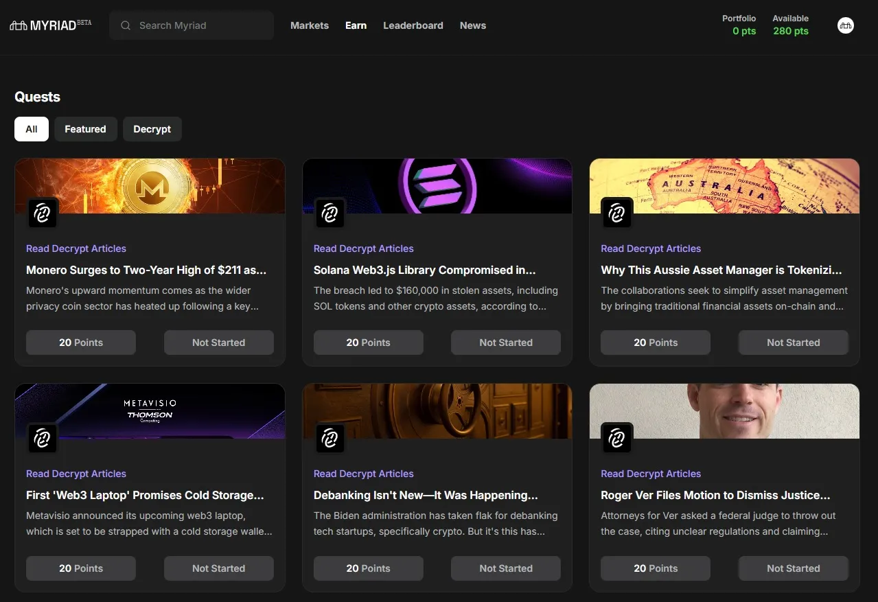También puedes ganar puntos completando las Misiones MYRIAD, que establecen una serie de tareas vinculadas como leer una historia de Decrypt y luego completar un cuestionario basado en ella, con puntos otorgados por completar cada tarea.