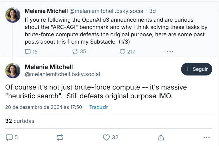Un punto de vista similar es compartido por otros científicos de IA, como la galardonada investigadora de IA Melanie Mitchel, quien argumentó que O3 no está realmente razonando sino realizando una "búsqueda heurística".