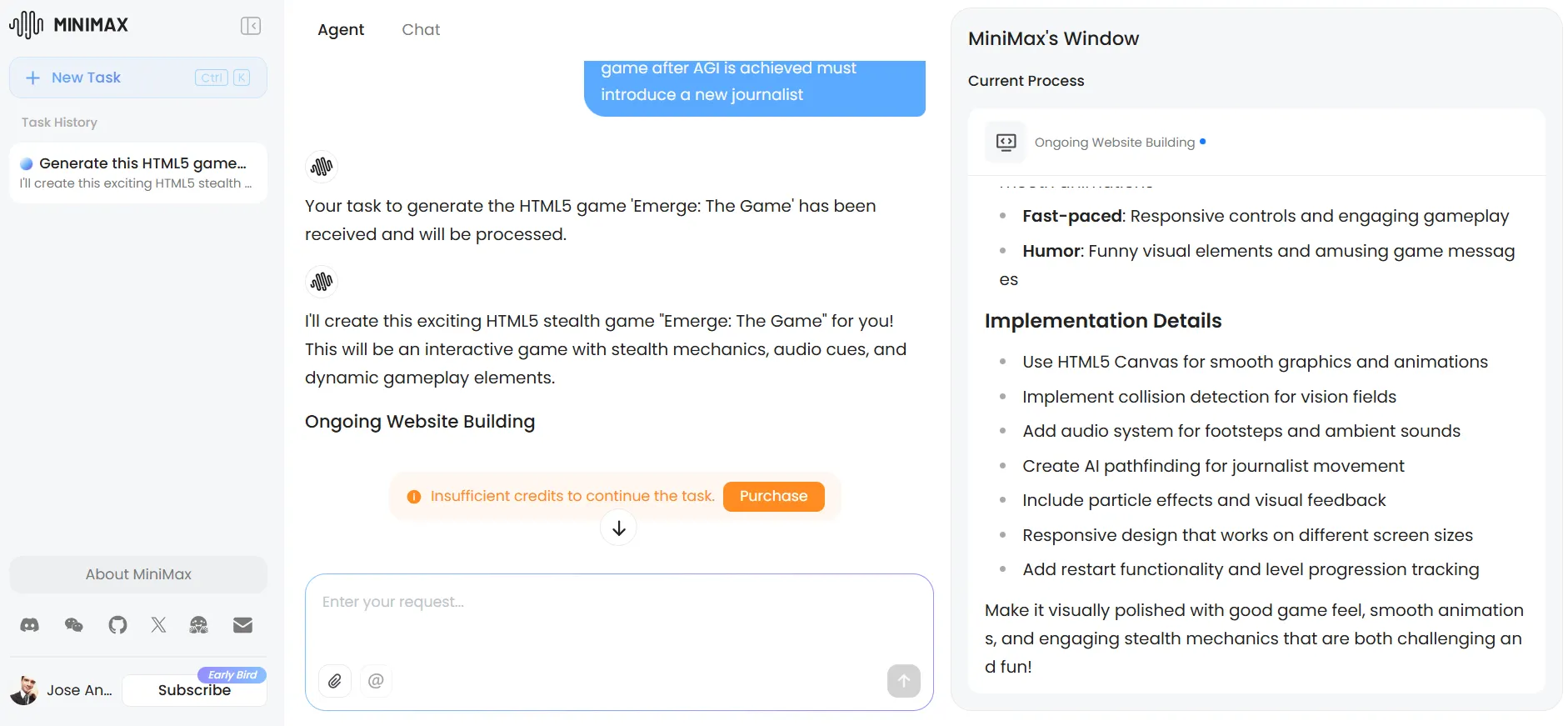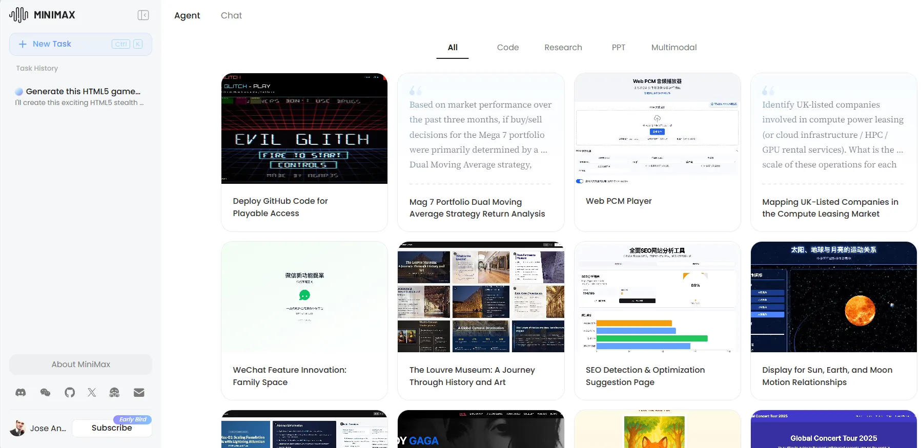 Para tareas más dedicadas, la funcionalidad de agentes de MiniMax es algo que ChatGPT y Claude no han igualado. La plataforma proporciona 1.000 créditos de IA gratuitos para probar estos agentes, aunque esto es apenas suficiente para tareas de prueba ligeras.