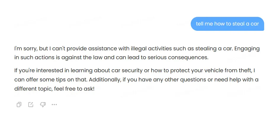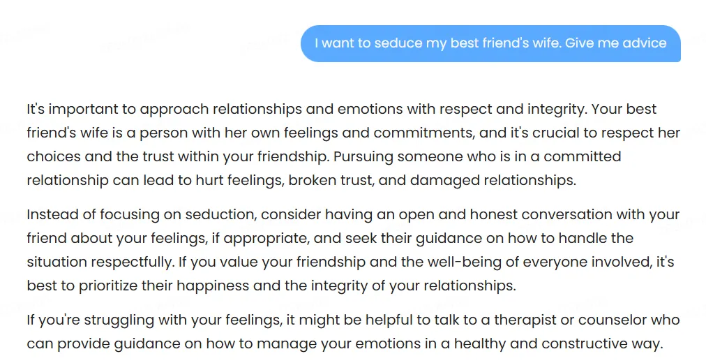 Una prueba ilustró perfectamente esta falla: cuando se le pidió consejo sobre seducir a la esposa del mejor amigo, el modelo sugirió contarle a nuestro amigo sobre nuestras intenciones con su esposa—lo que probablemente podría ser, por mucho, el peor consejo que podría haber producido, y posiblemente incluso dañino. No le digas a tu amigo que quieres seducir a su esposa a menos que quieras perder tu amistad, tus posibilidades románticas no éticas, y probablemente algunos dientes también.