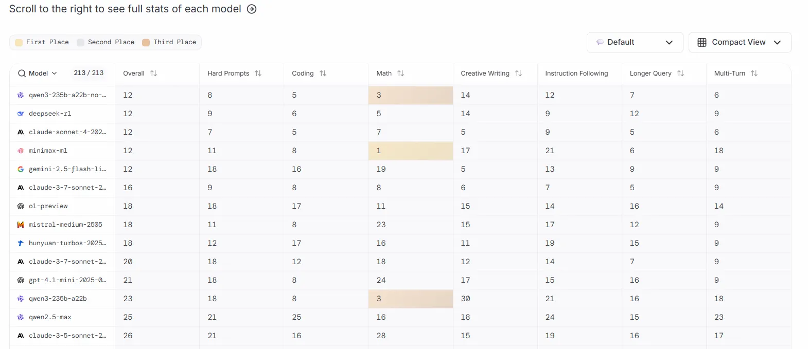 Sin embargo, la tabla de clasificación de LLM Arena presenta un panorama ligeramente diferente. La plataforma actualmente clasifica a MiniMax-M1 y DeepSeek empatados en el puesto 12 junto con Claude 4 Sonnet y Qwen3-235b. Con cada modelo teniendo mejor o peor rendimiento que los otros dependiendo de la tarea.