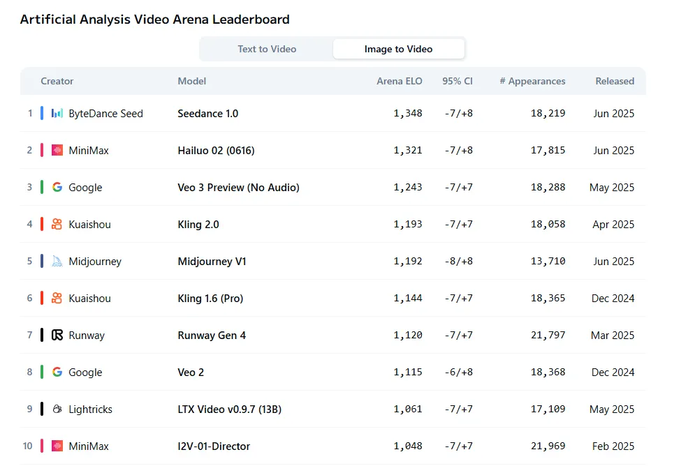 MiniMax no se detuvo en modelos de lenguaje durante su semana de anuncios. La empresa también lanzó Hailuo 2, que ahora se clasifica como el segundo mejor generador de video para tareas de imagen a video, según las evaluaciones subjetivas de Artificial Analysis Arena. El modelo solo queda por detrás de Seedance mientras supera a jugadores establecidos como Veo y Kling.
