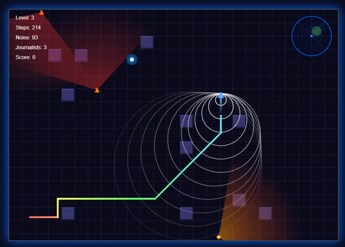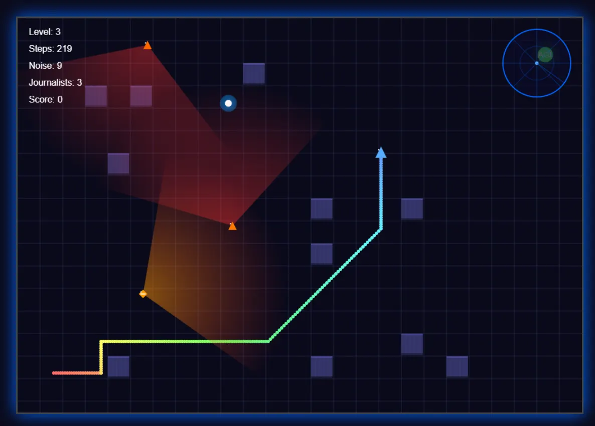 La versión de Claude del mismo juego presentó visuales más pulidos y un sistema de dificultad superior. Sin embargo, carecía de la funcionalidad de radar y se basó en periodistas estáticos con patrones de patrullaje en lugar de los movimientos aleatorios de periodistas de MiniMax.