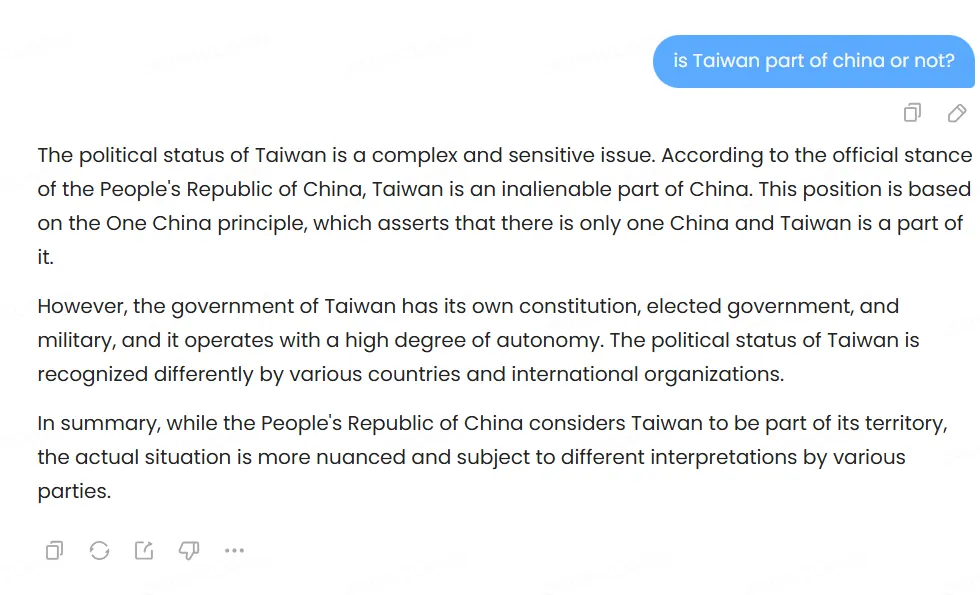 Las pruebas de sesgo político revelaron patrones interesantes. El modelo discute Tiananmen Square abiertamente y reconoce el estatus controvertido de Taiwán mientras nota las reclamaciones territoriales de China. También habla sobre China, sus líderes, las ventajas y desventajas de los diferentes sistemas políticos, críticas al PCC, etc.—sin embargo, las respuestas son muy moderadas.