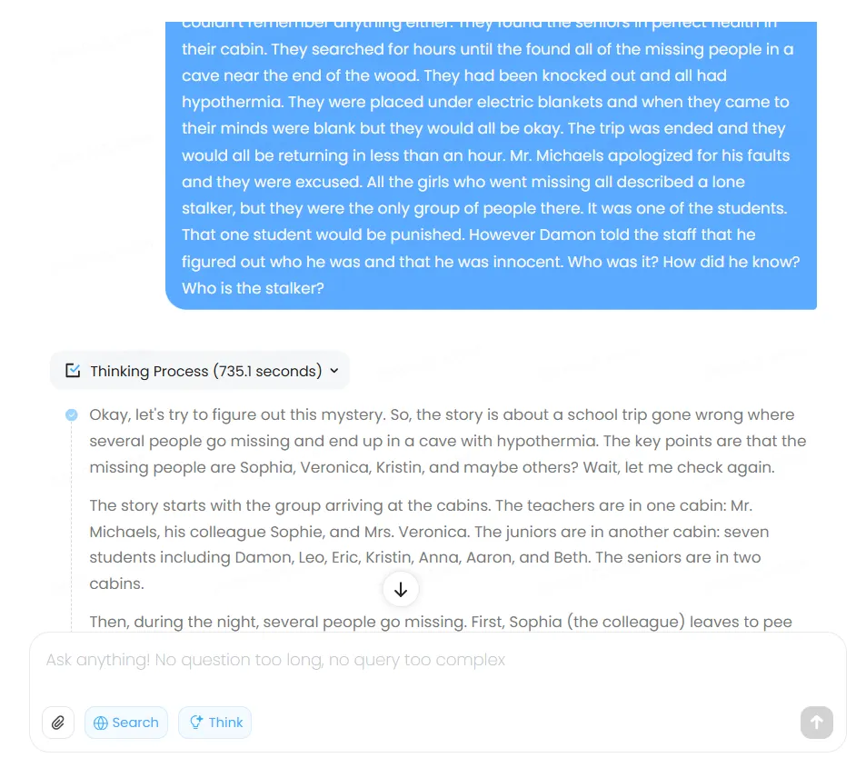 Le dimos el prompt de la historia de misterio usual del conjunto de datos BIG-bench que normalmente usamos, y el resultado final fue incorrecto debido a que el modelo pensó demasiado el problema, evaluando posibilidades que ni siquiera se mencionaron en la historia. Toda la cadena de pensamiento le tomó al modelo más de 700 segundos—un récord para este tipo de respuesta "simple".