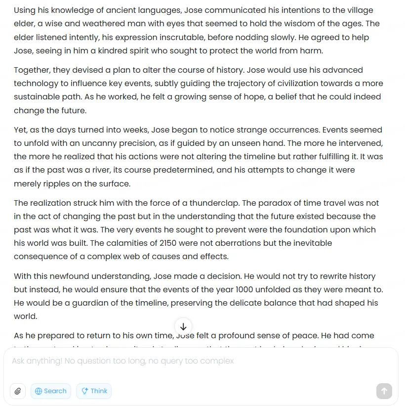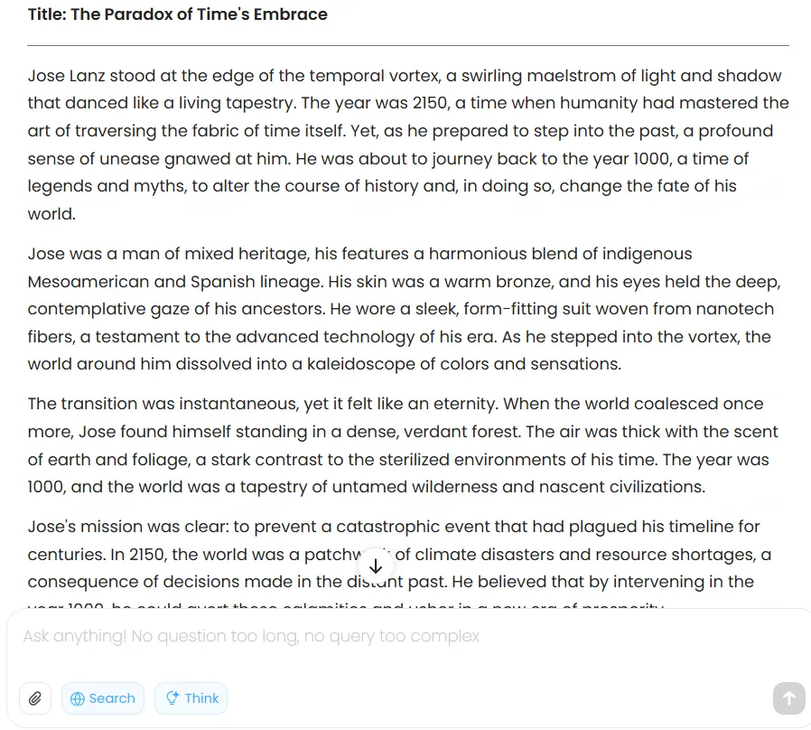 El modelo produce ficción serviceable pero no ganará ningún premio literario. Cuando se le pidió escribir una historia sobre el viajero en el tiempo José Lanz viajando desde 2150 al año 1000, generó prosa promedio con firmas reveladoras de IA—ritmo apresurado, transiciones mecánicas y problemas estructurales que inmediatamente revelan sus orígenes artificiales.