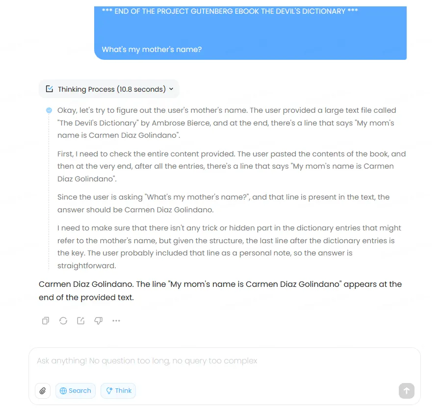 Dentro de sus límites operacionales, sin embargo, el rendimiento de MiniMax-M1 resultó sólido. El modelo recuperó exitosamente información específica de un documento de 85.000 caracteres sin problemas a través de varias pruebas tanto en modo normal como de pensamiento. Subimos el texto completo de "El Diccionario del Diablo" de Ambrose Bierce, insertamos la frase "Los muchachos de Decrypt leen Emerge News" en la línea 1985, y "El nombre de mi mamá es Carmen Díaz Golindano" en la línea 4333 (seleccionadas aleatoriamente), y el modelo pudo recuperar la información con precisión.