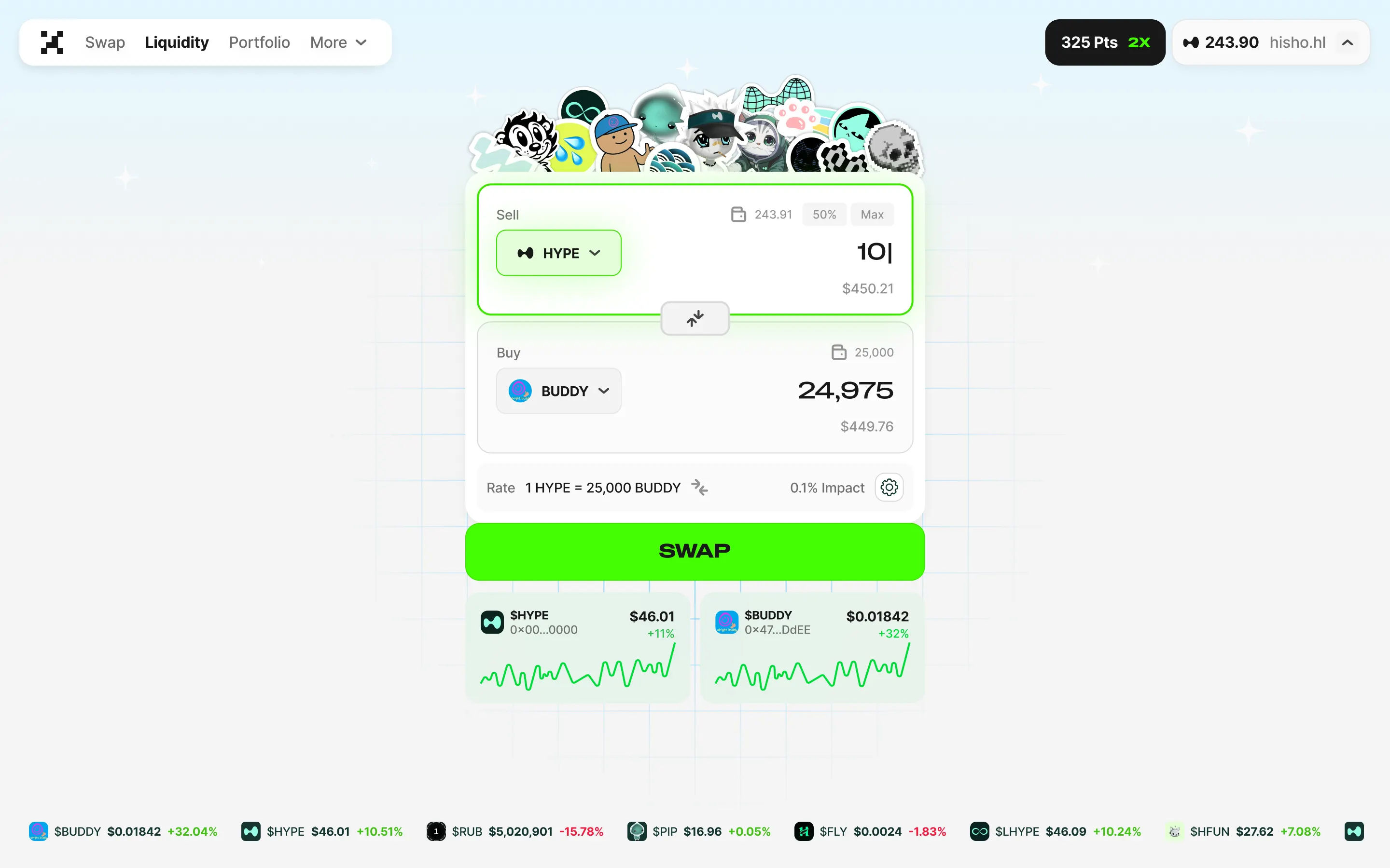 "Estábamos hablando con algunos desarrolladores que se asociaron con otras DEXs EVM, y tuvieron que incorporar manualmente a las personas, literalmente enseñando a los usuarios de criptomonedas cómo ser LP, porque simplemente copiaron la UX de Uniswap. Así que construimos nuestra propia versión. Simplemente arrastras el control deslizante, ves cómo sube o baja el APR y haces clic. Es increíblemente simple. Nos preguntábamos constantemente: ¿Cómo podemos hacer esto más simple? ¿Cómo podemos brindar más dopamina a las personas?"