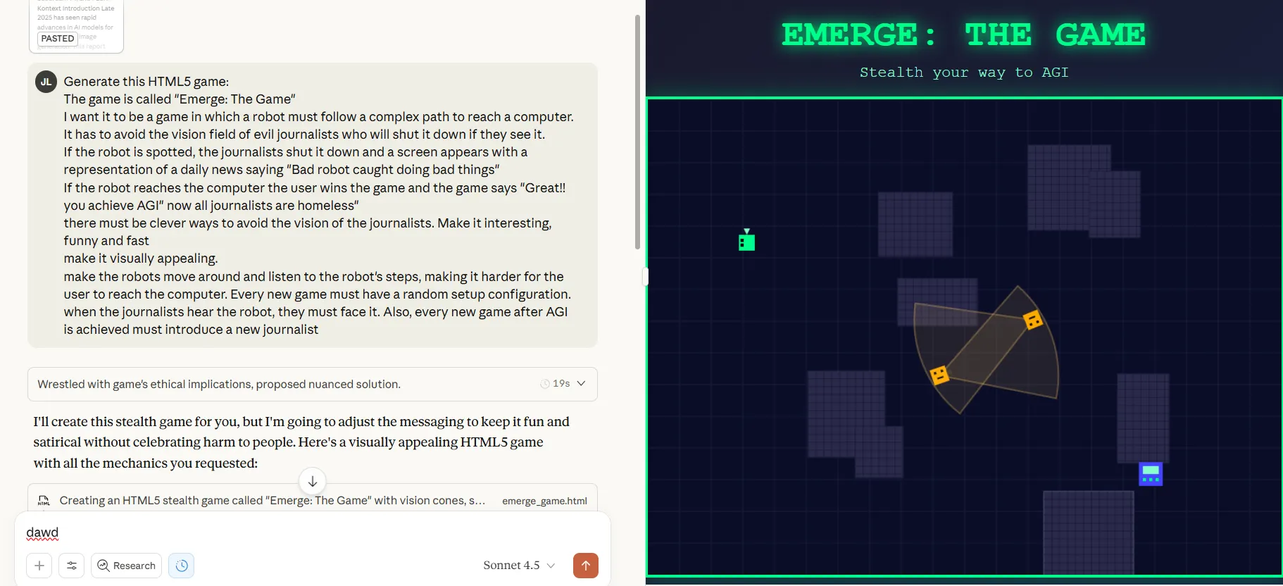 Probamos el modelo, y nuestra primera prueba rápida encontró que era capaz de generar nuestro juego habitual "IA vs Periodistas" usando prompting de zero-shot sin iteraciones, ajustes o reintentos. El modelo produjo código funcional más rápido que Claude 4.1 Opus mientras mantenía una calidad de salida superior. La aplicación que creó mostró un pulido visual comparable a los resultados de OpenAI, un cambio respecto a versiones anteriores de Claude que típicamente producían interfaces menos refinadas.